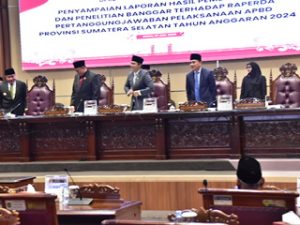 Palembang,kanalpers.com—Dewan Perwakilan Rakyat Daerah Provinsi Sumatera Selatan (DPRD Prov.Sumsel) mendengarkan jawaban Gubernur atas Pandangan umum Fraks-fraksi terhadap rancangan Peraturan Daerah (Raperda) Prov.Sumsel tentang perubahan APBD Prov.Sumsel Tahun Anggaran (TA) 2025 pada Rapat Paripurna XVlll (18) lanjutan DPRD Prov.Sumsel hari ini (Jumat, 25/7) setelah sebelumnya Masing-masing Fraksi menyampaikan Pandagan Umumnya pada Paripurna Senin lalu (21/7).